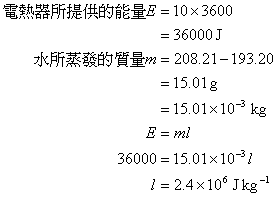 - 如果重覆此實驗,未必能得到零誤差,原因如下:根據題二作出的分析,估計因素 (1) 和 (2) 引起的百分誤差少於 2%,並且或多或少會部分抵消。如果只考慮因素 (3),水吸收的實際能量略少於電熱器輸出的能量,量得的 l 值會比公認值大,估計由此引起的系統誤差為 +3%。又單由因素 (4) 亦有可能出現 ±2% 的隨機誤差。所以如果不知道公認值,此實驗產生的誤差約在 (0 - 5)% 之間。