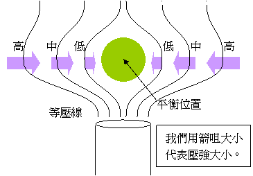 參考下圖,如球移向右面,右側氣流受阻,流速降低,壓強增大,迫使氣球反回平衡位置。同理,球向其他方向移動亦有相同效應。