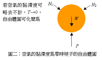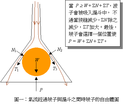當空氣由漏斗吹出,空氣以較高的速度流過漏斗與波子之間的位置,壓強下降。由波子的受力圖(圖一)可知氣流通道越狹,流速越高,壓強在狹道附近產生的正壓力