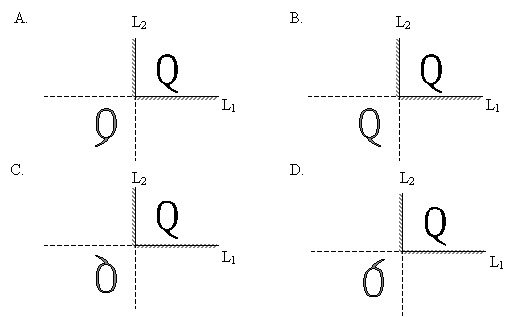 有一寫上字母‘Q’的紙板位於兩塊互相垂直的平面鏡間。 下列那一俯視圖正確地顯示物‘Q’經兩塊平面鏡反射後所得的成像?
