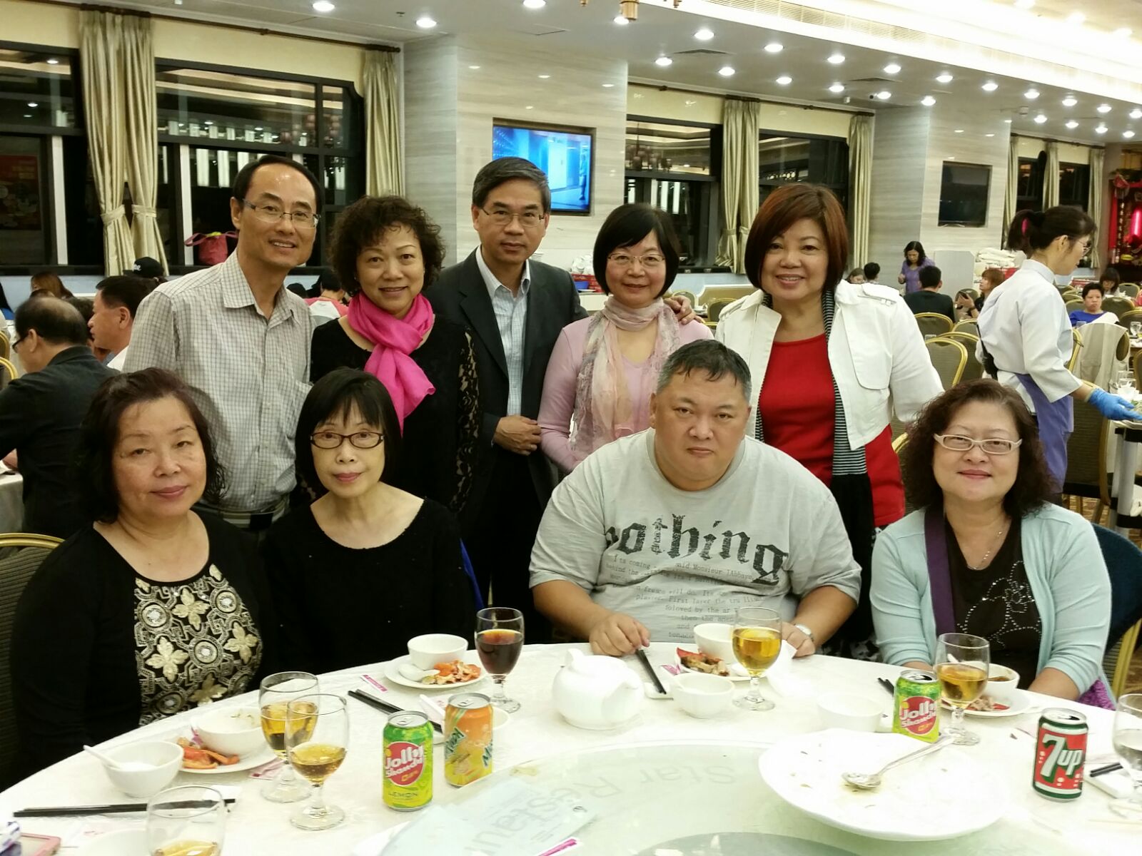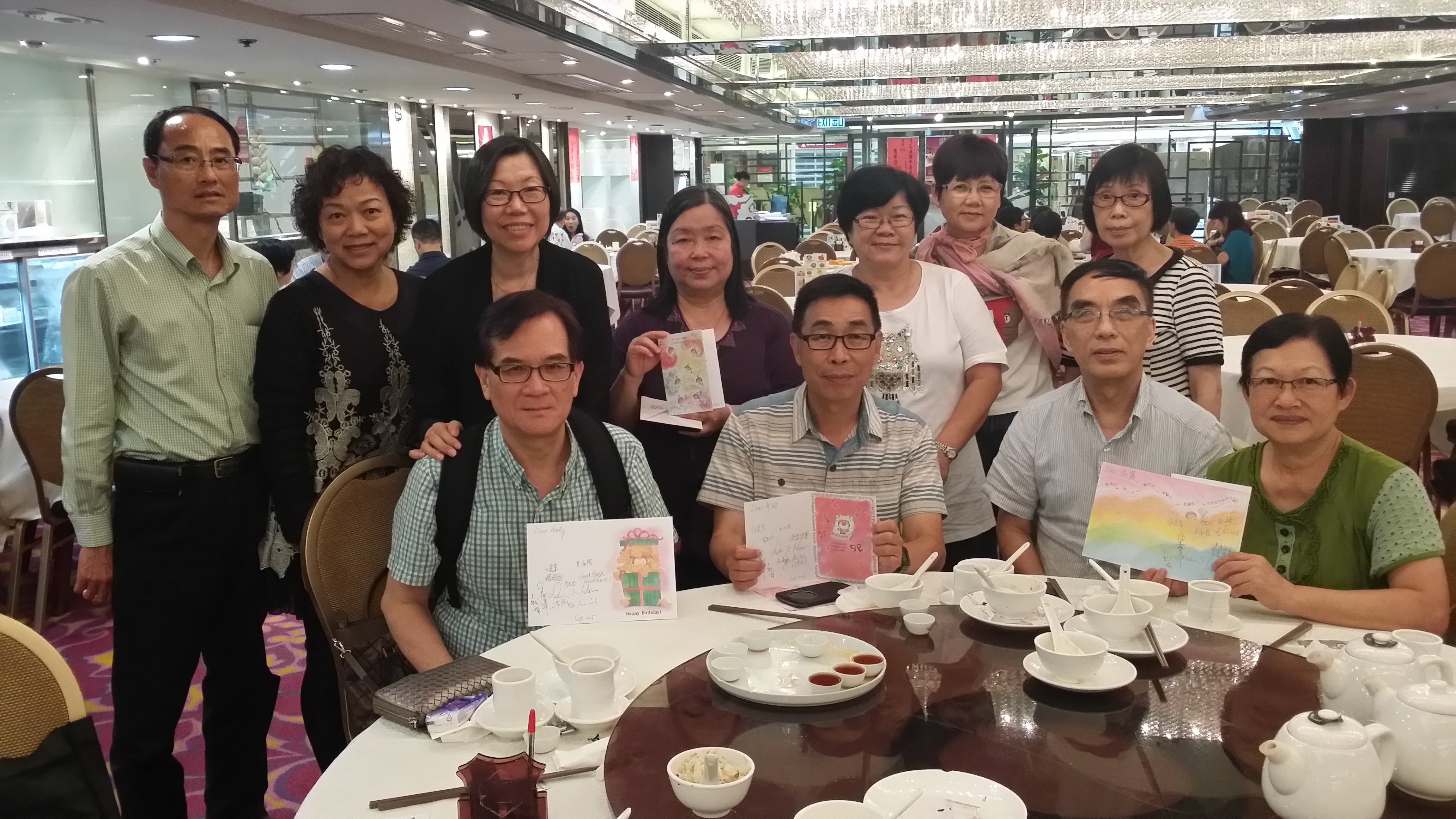 ![]() 2015年8月:適逢陳權/尹秀玲校友回港, 有四圍校友参加, 開心熱鬧共聚共慶8月份生日宴。 |