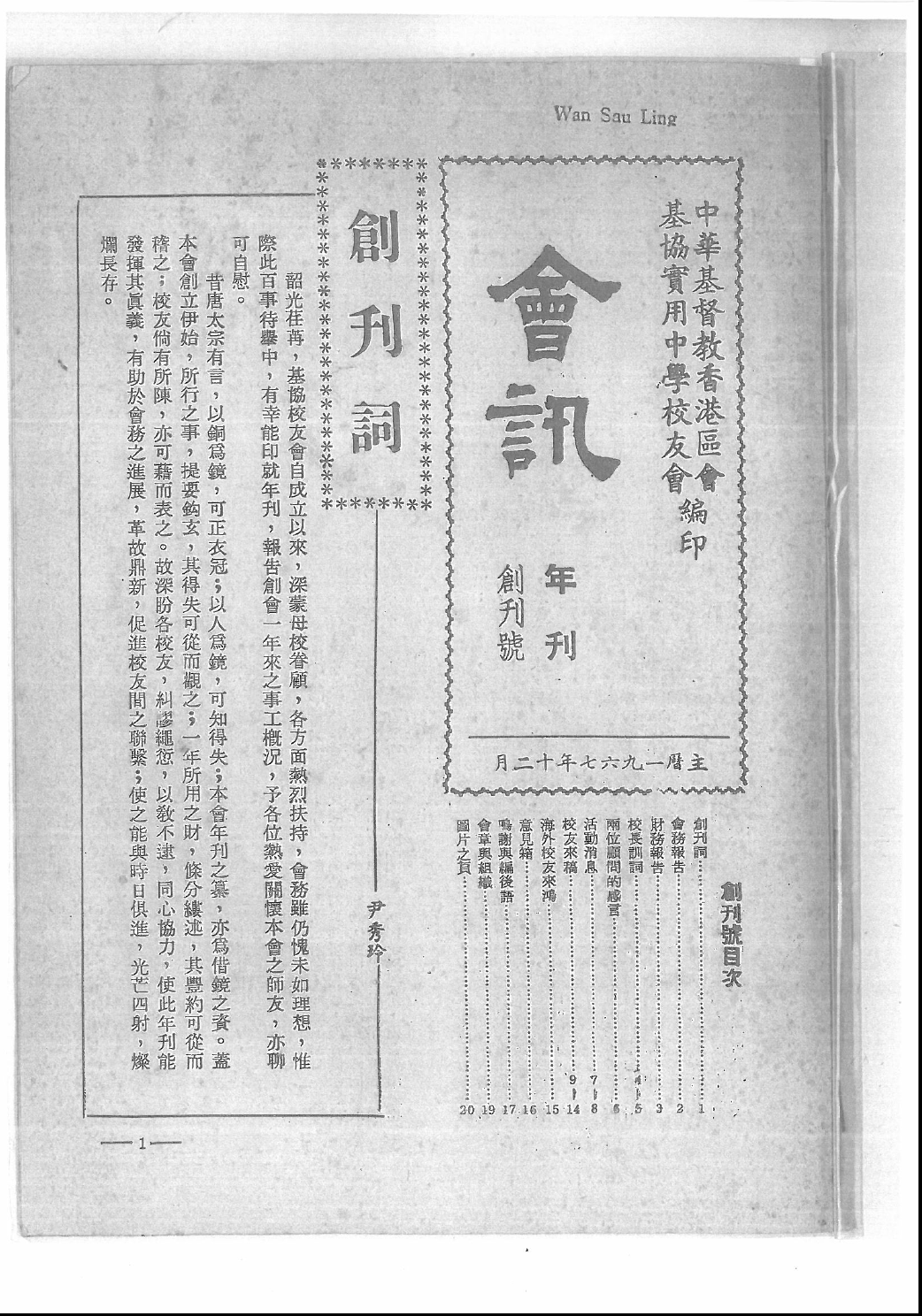 一九六六至六七首屆執委 主席: 尹秀玲 副主席: 陳權 文書: 梁婉雲 財務: 梁惠貞 首屆委員 羅頌平 陳鶴鵬 黃秋瑞 譚秋芳 區悅慈 郭合想 吳燕娜 譚煥丁 李美紅 陳秀瑛 譚蓮秋 梁玉琴 夏玉林 吳振華 林少泉 易榮傑 李淦熊 陳創基 梅光龍 一九六七年畢業班四位代表 趙玲 李科展 陳智玲 黃小文