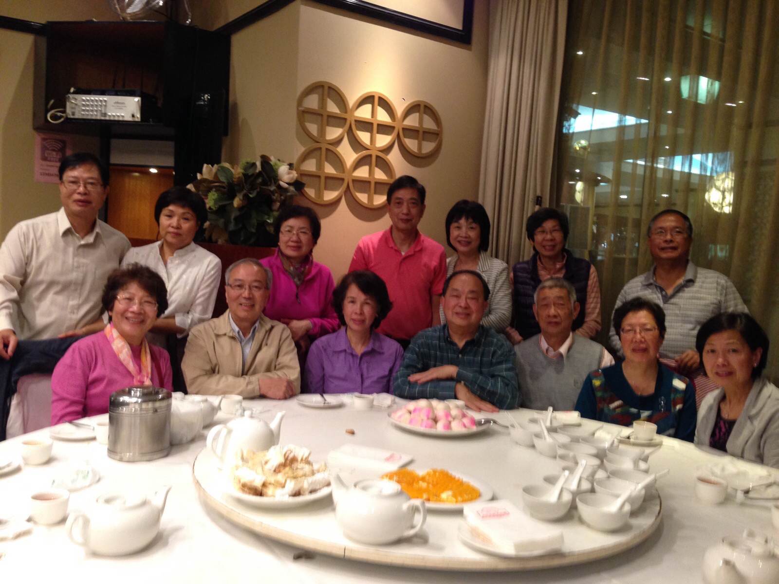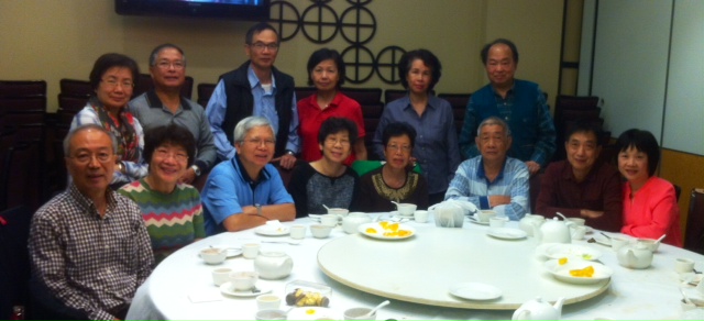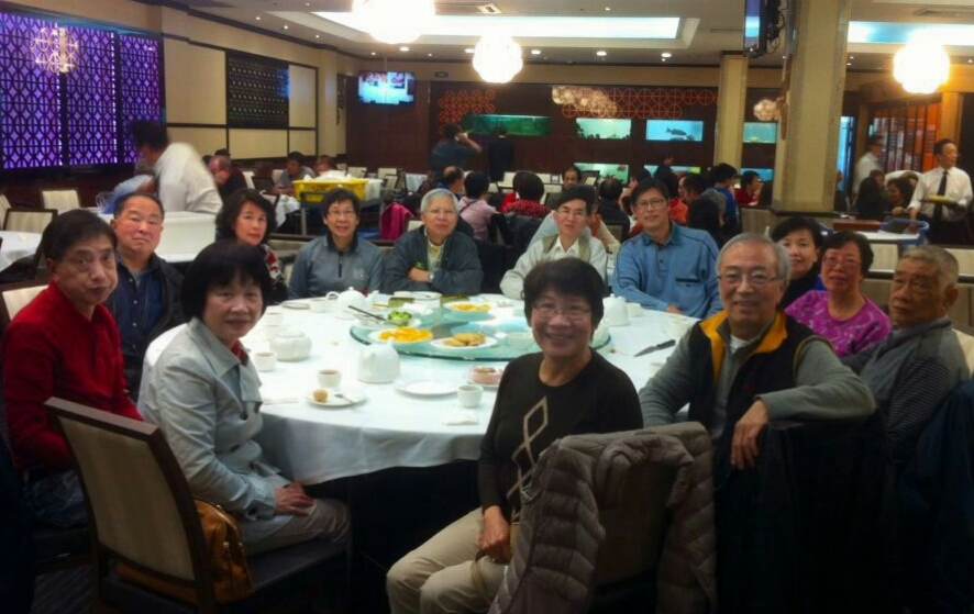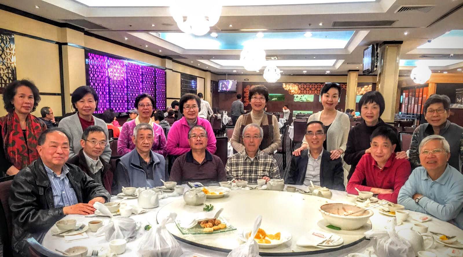 2015年4月19日雪梨校友𢹂眷出席大三元酒家晚飯,歡迎來自美國紐約的66年校友謝天惠伉儷,還有剛從澳洲達爾文飛抵雪梨探親的同屆校友何浩權伉儷,16人筵開兩席歡宴後留影。 |