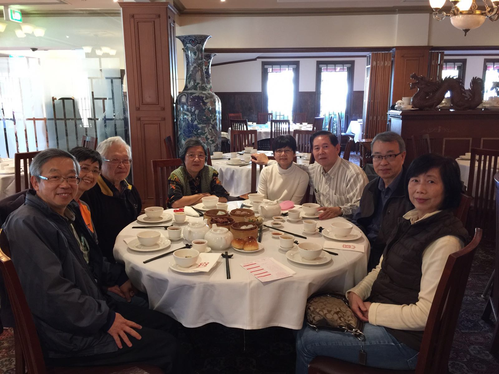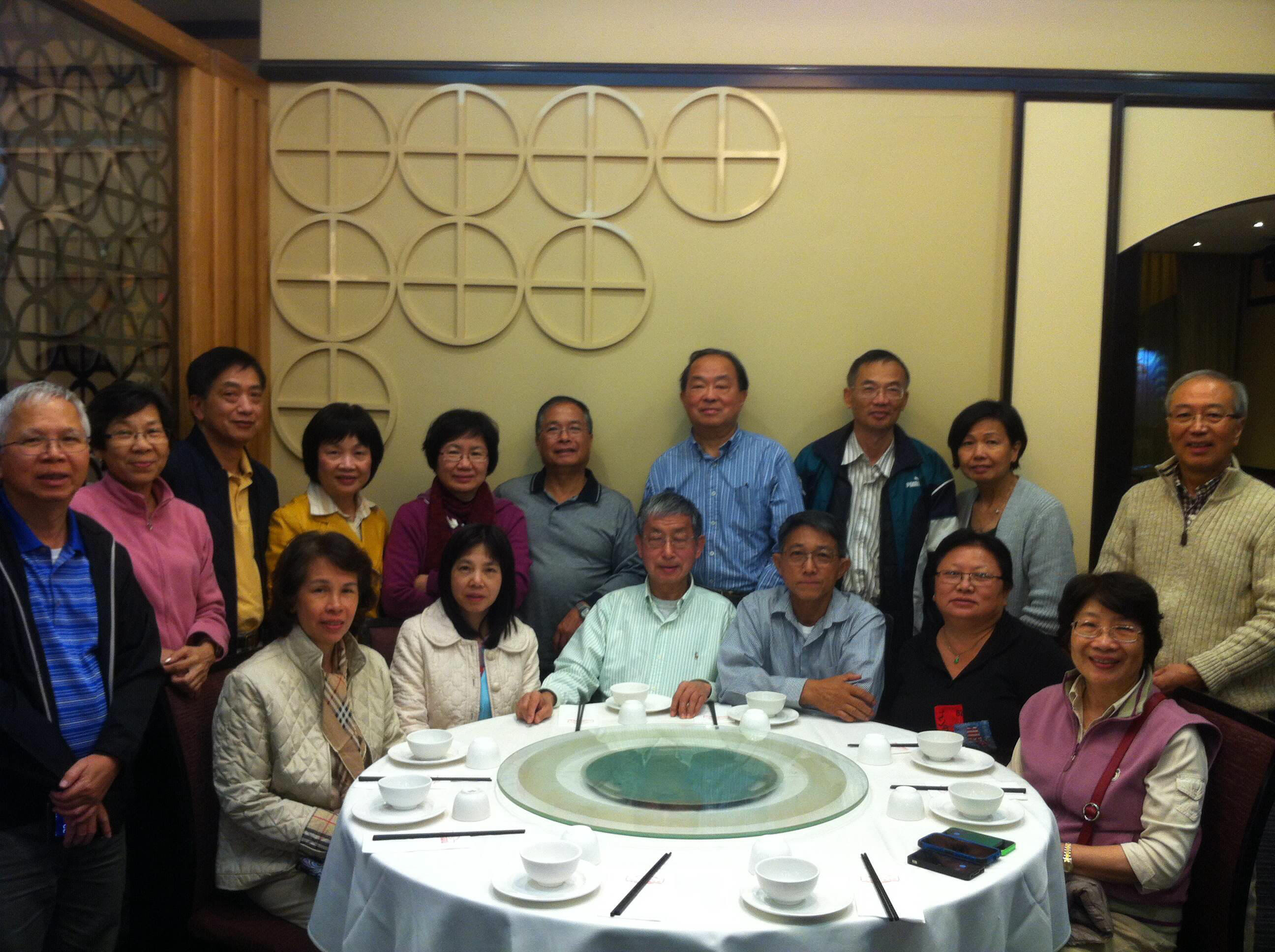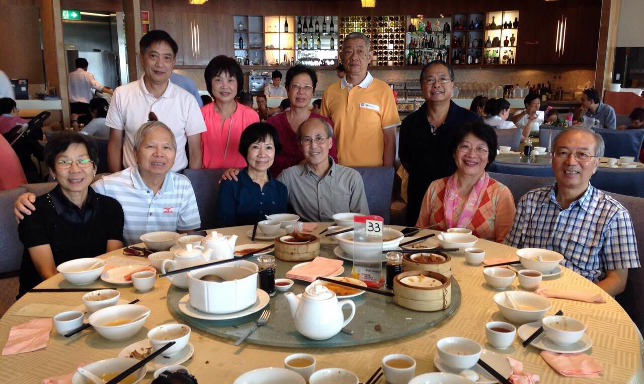 2015年4月19日雪梨校友𢹂眷出席大三元酒家晚飯,歡迎來自美國紐約的66年校友謝天惠伉儷,還有剛從澳洲達爾文飛抵雪梨探親的同屆校友何浩權伉儷,16人筵開兩席歡宴後留影。 |
